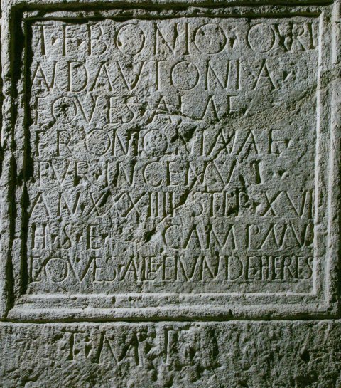 - T(itus) F(lavius) Bonio Qu(i)r(ina) / Andautonia / eques alae / Frontonianae / tur(ma) Ingenui / an(norum) XXXIIII stip(endiorum) XVI / h(ic) (itus) e(st) Campanus {S} / eques al(a)e eiunde(!) heres // t(itulum) m(emoriae) p(osuit)