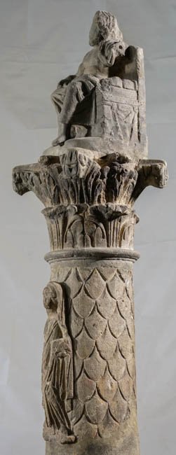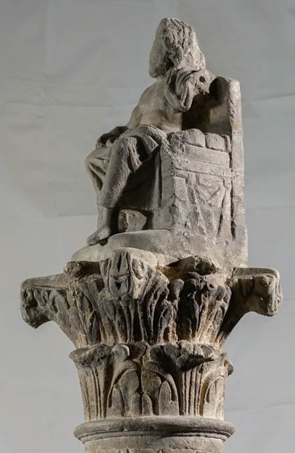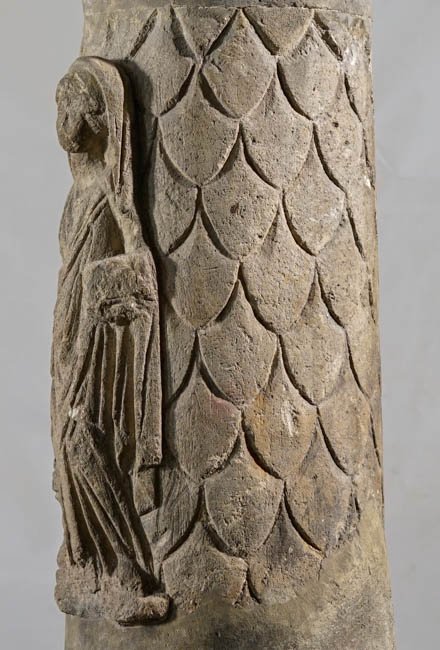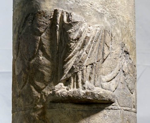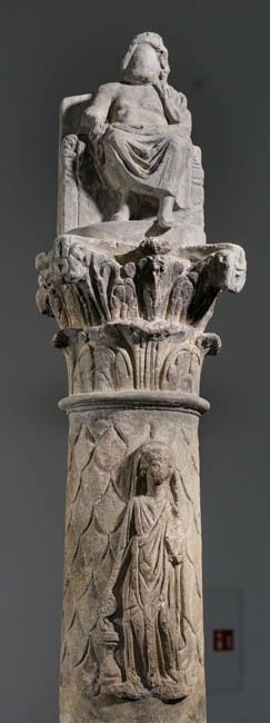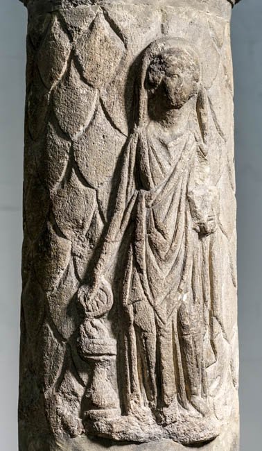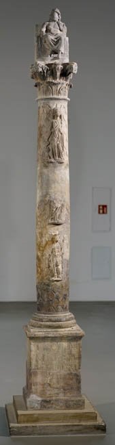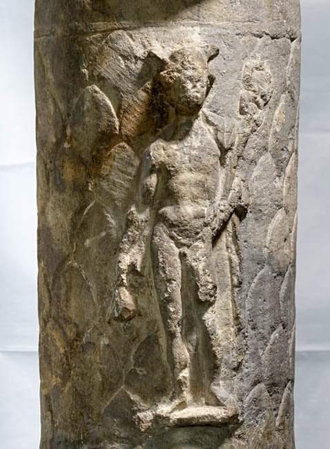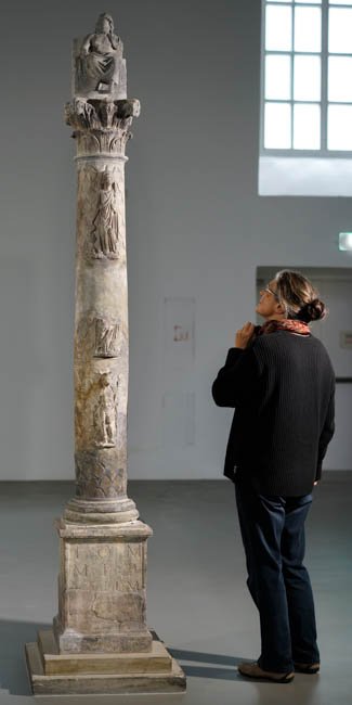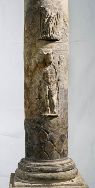 - Vierseitiger Sockel mit Votivinschrift, Schuppensäule mit attischer Basis und korinthischem Kapitell. Auf dem Schaft drei auf Standleisten stehende Relieffiguren: unten Mercur mit Flügelkappe, Caduceus und Geldbeutel, in der Mitte Minerva (nur Unterteil erhalten) mit Lanze und Schild, oben Juno mit Schleier, mit der Rechten Schale über einem Altar ausgießend, in der Linken Kanne. Auf dem Kapitell thronender Jupiter.