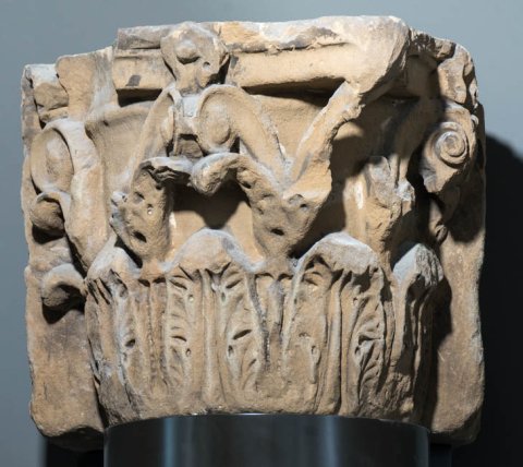 - korinthisches Säulenkapitell mit angearbeitetem Wandteil (drei weitere vom selben Typus: Inv. 1089, 1373, 1372)