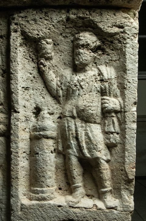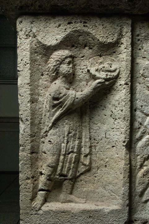 Gerahmtes Schriftfeld, an den Schmalseiten Blattornament. Außen je 1 Bogennische. Links Diener mit halblanger Tunica, in den erhobenen Händen Platte. Rechts Diener mit kurzer gegürteter Tunica und Stiefeln, in der Rechten Becher, über der linken Schulter Tuch (mappa) mit Fransen. Vor ihm Laterne. - Inschrift