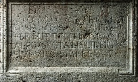 - D(is) M(anibus) / domo aeternae / et perpetuae securitati / permittente patrono / Alfius Vitalis libertus / eius vi(v)us sibi fecit