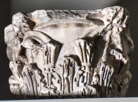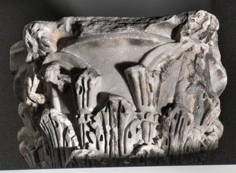 - Voluten, Blattspitzen u. Abacusränder abgebr., in der Unterseite Dübellöcher