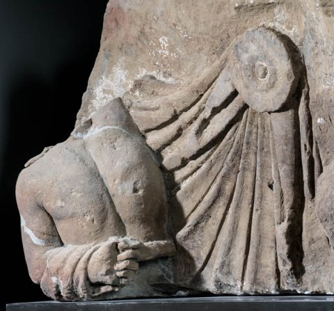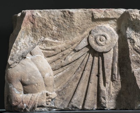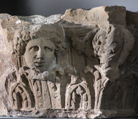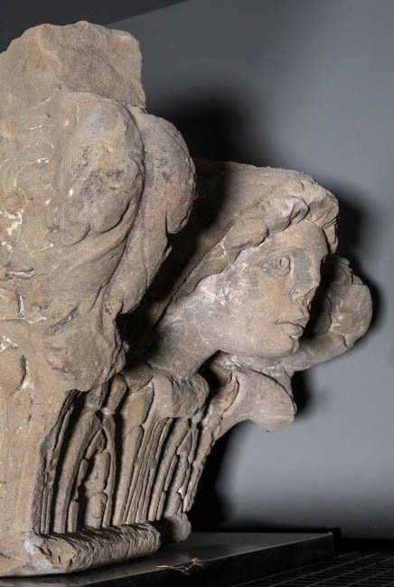 - Eckpilaster-Kapitell mit aus dem Blattkranz ragenden jugendlichen Köpfen (links Jüngling mit Weinlaubkranz, rechts Frau mit Schleier). Links schließt Reliefzone mit aufgehängter Draperie und nach links vorgeneigter männlicher Figur in Rückenansicht an. Ihr rechter Arm war erhoben, der linke auf den Rücken gelegt.