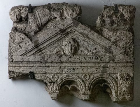 - Gerahmter Giebel mit Gorgoneion und Palmettenakroteren. Auf den Giebelschrägen liegende Löwen mit Widderköpfen in den Pranken, zwischen ihnen (auf dem First) Maske. Unter dem Giebel profiliertes Gesims und drei enge Bögen mit Muschelnischen. In den Bogenzwickeln Rosetten. Außen Säule mit Blattkapitell.