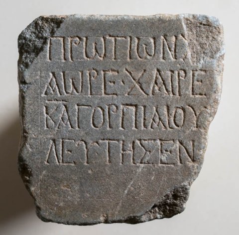 - griechisch: Πρωτίων χ[---] / ἄωρε Χαιρε [--] / καὶ Γορπιαίου [ἐτε]/λεύτησεν [---]