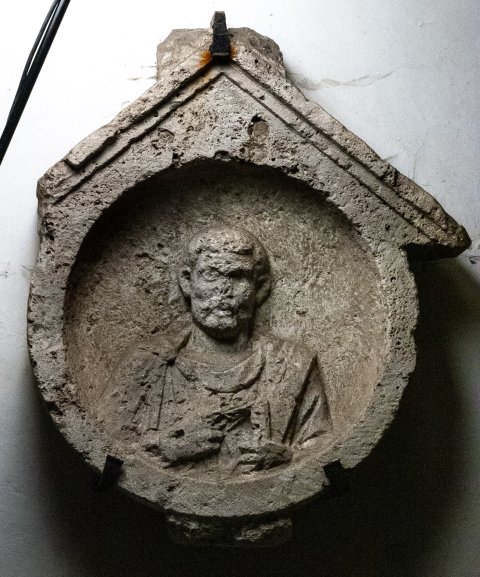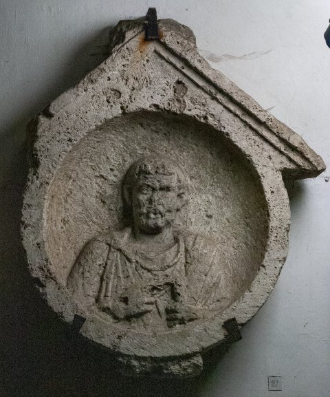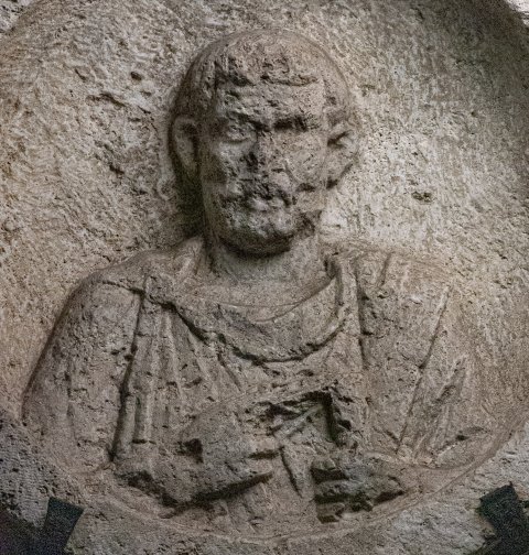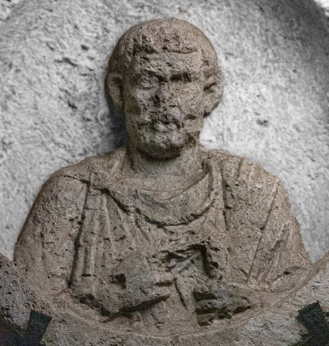 - In glattem Rahmen Brustbild eines Mannes: bärtig, Ärmeltunica, Sagum, Scheibenfibel, in der Linken Rolle (volumen). Über dem Medaillon Giebel.