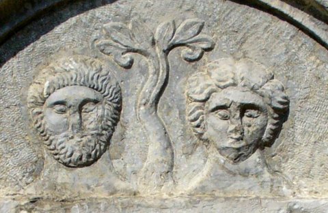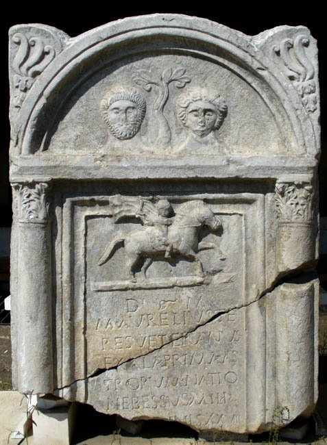 - Gerahmte Bogennische mit zwei Büsten (Ehepaar), dazwischen Baum. Seitlich Palmettenakrotere. Gerahmtes Schriftfeld zwischen Säulen, über der Inschrift Standleiste mit Reiter (Soldat).