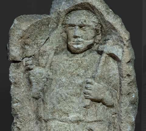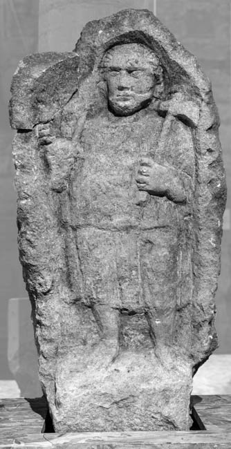- Stehender bärtigerMann in kurzer Tunica, in der Linken Axt, in der Rechten Tierkopf.