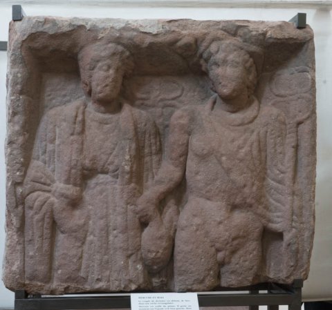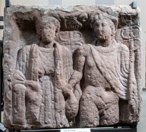 - Mythische Figuren: Mercur mit Flügelkappe und Mantel um Schultern und linken Arm, in der Rechten Geldbeutel. Maia in gegürteter Tunica, Mantel über den Schultern. Beide mit Caduceus im linken Arm.