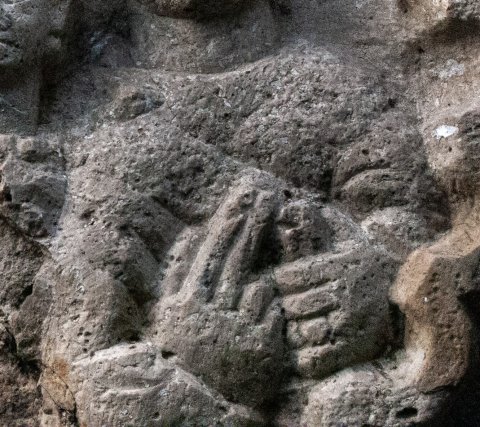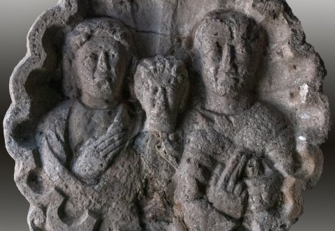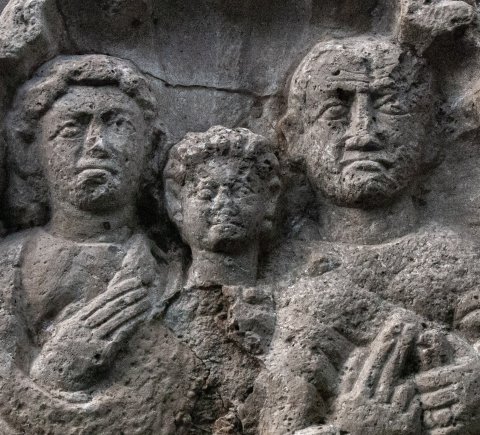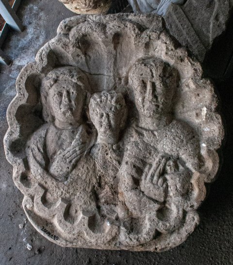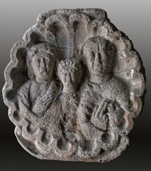 - Familie: in Muschelnische mit gewelltem Rand Halbfiguren eines Ehepaares mit Kind. Links Frau: severische Frisur, Tunica, Mantel. Rechts Mann: bärtig, Sagum, Bügelfibel, Fingerring, in der Linken Rolle (volumen). Zwischen den Eltern Knabe mit Locken.