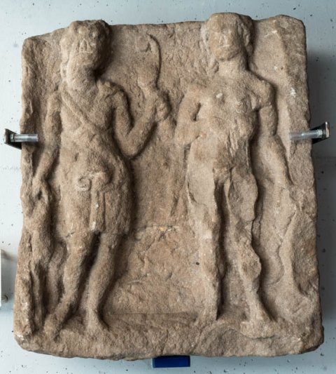 - Mythische Figuren: Diana mit Bogen und Köcher(?) in der Linken, neben dem rechten Bein Hirschkuh (Hund ?). Apollo mit Bogen in der Linken.