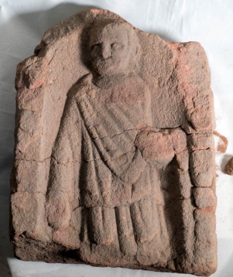 - Stehender bärtiger Mann in Ärmeltunica und Sagum, in der Rechten Schale (über einem Altar ?), im linken Arm Kästchen (?). Rechts am Rahmen Stab (vitis ?).