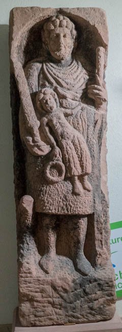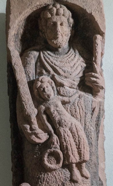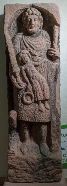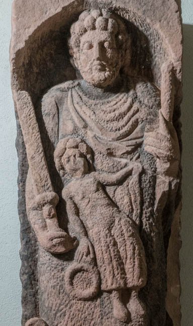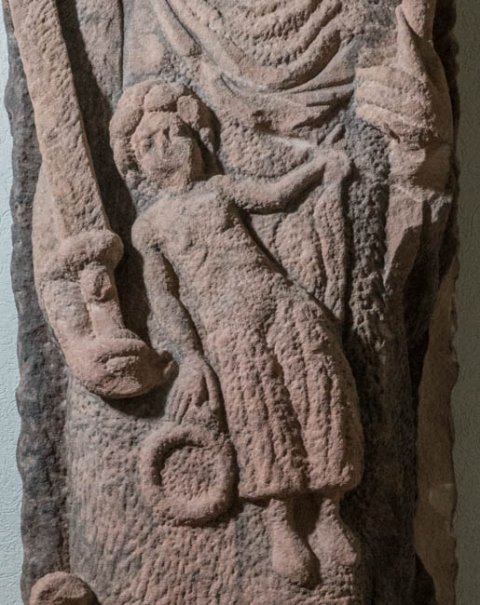 - Mythische Figuren: in Bogennische stehender bärtiger Gott (Mars ?) im Mantel mit Scheibenfibel auf der rechten Schulter, im rechten Arm Schwert, in der Linken Stab. Vor ihm kleine schwebende Victoria (Nemetona ?) mit Kranz in der Rechten.