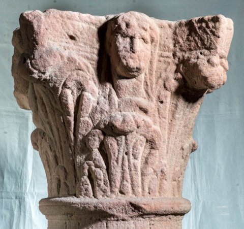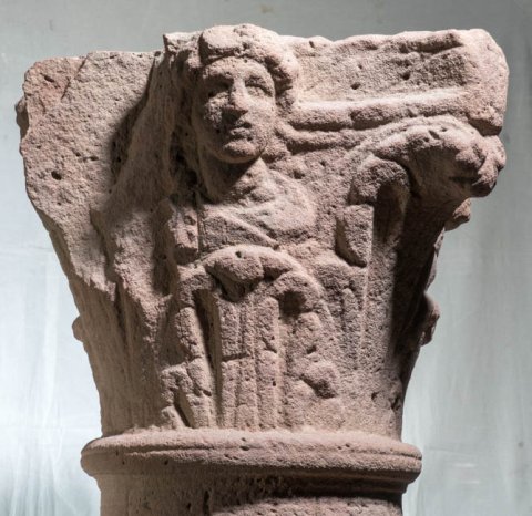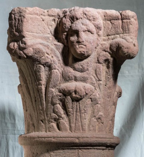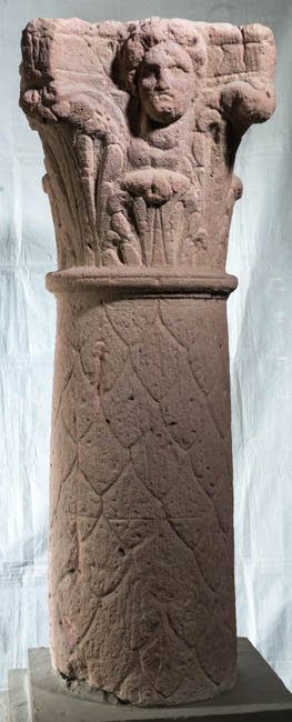 - Geschuppter Säulenschaft, korinthisches Kapitell mit Büsten von Personifikationen der Jahreszeiten.