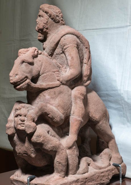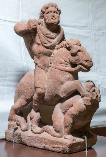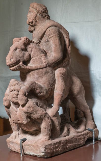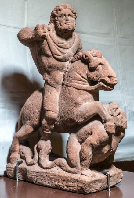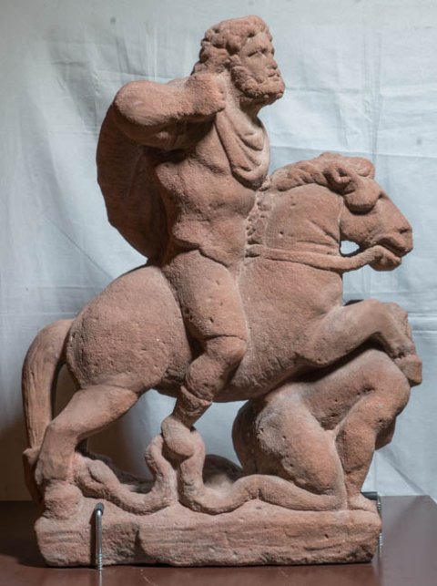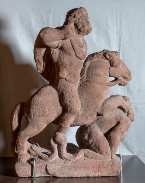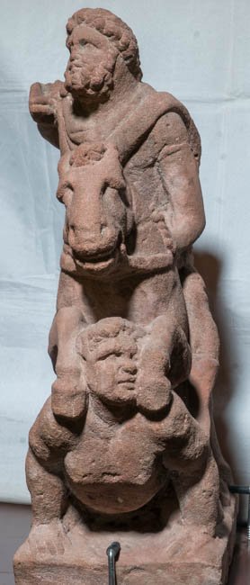 - Mythische Figuren: über einen auf dem Bauch liegenden Giganten hinweg reitender Jupiter.