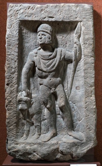- Mythische Figur: Mars (?). Gott mit Helm und Schultermantel, in der Linken Lanze, die Rechte auf dem Kopf eines stehenden Stiers.