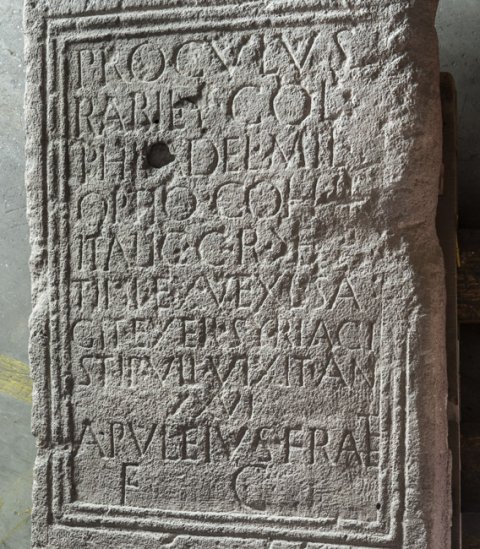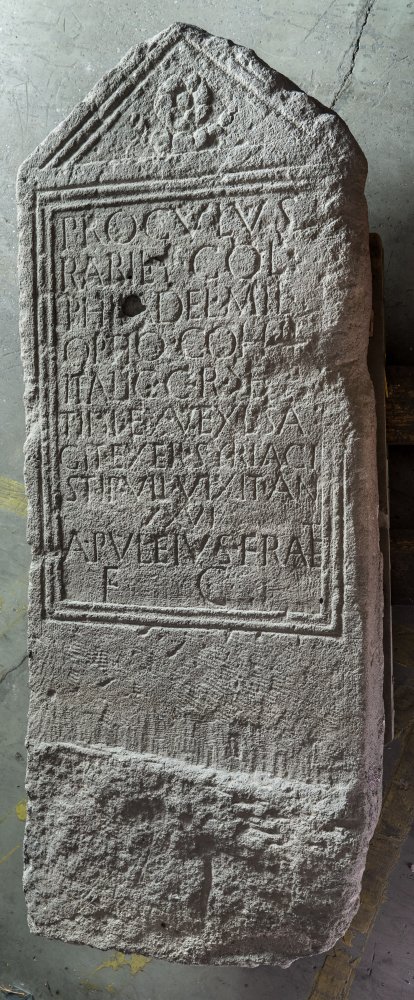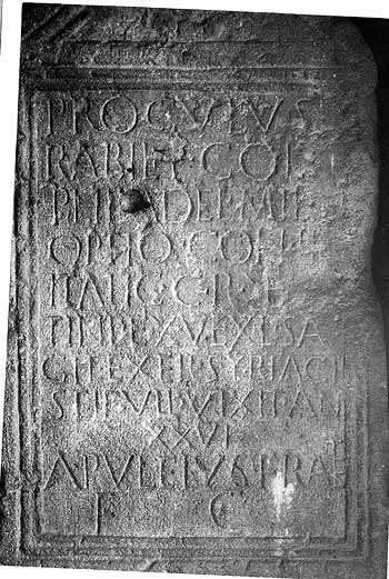 - Proculus / Rabili(i) f(ilius) Col(lina) / Philadel(phia) mil(es) / optio coh(ortis) II / Italic(ae) c(ivium) R(omanorum) (centuria) Fa(us)/tini ex vexil(latione) sa/git(tariorum) exer(citus) Syriaci / stip(endiorum) VII vixit an(nos) / XXVI / Apuleius frate(r) / f(aciendum) c(uravit)