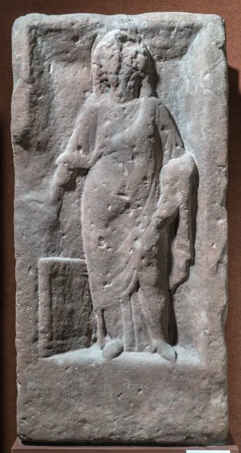 - Mythische Figur: Fortuna mit Füllhorn im linken Arm. Neben dem rechten Bein Altar (?).