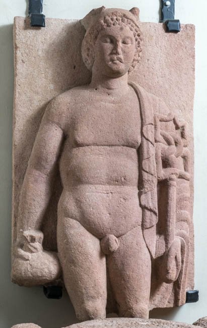 - Mythische Figur: Mercur mit Flügelkappe, Mantel auf der linken Schulter, im linken Arm Caduceus, in der Rechten Geldbeutel.
