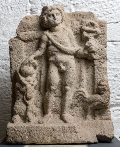 - Mythische Figur: Mercur mit Flügelkappe, Mantel um die Schultern, in der Linken Caduceus, in der Rechten Geldbeutel. Neben dem rechten Bein liegender Ziegelbock, neben dem linken Hahn.