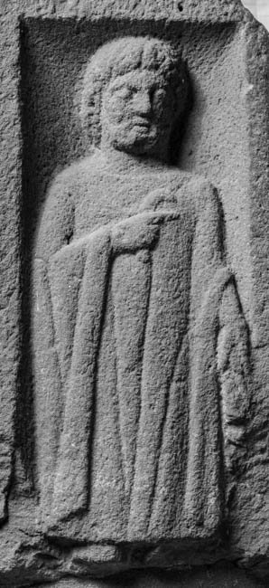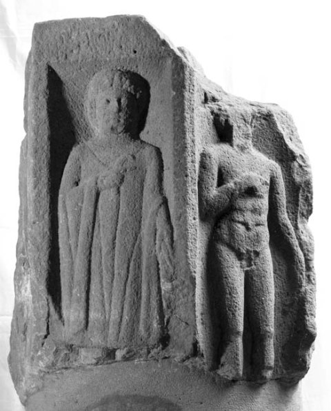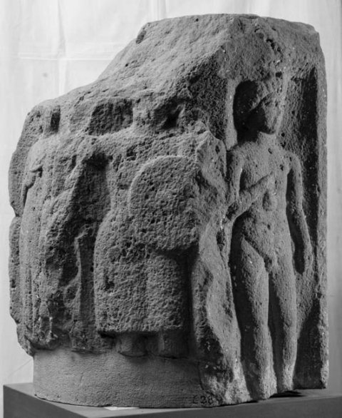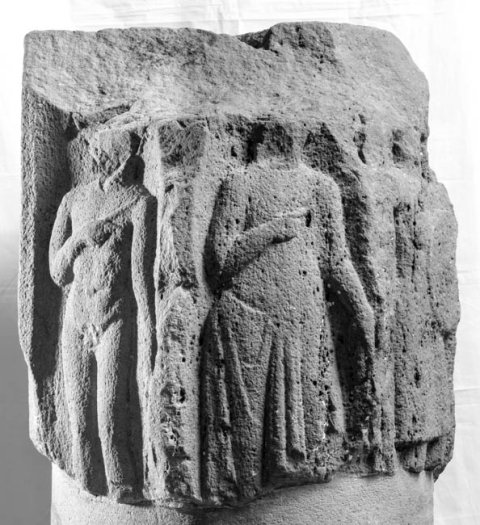 - oben u. unten abgebr., 2 Reliefs abgeschlagen, in der Oberseite Dübelloch