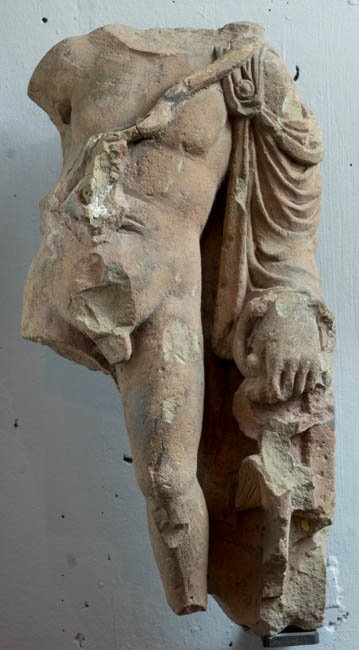 - Mythische Figur: auf den Caduceus gelehnter Mercur mit Mantel über der linken Schulter, auf der Brust Schlange (?).