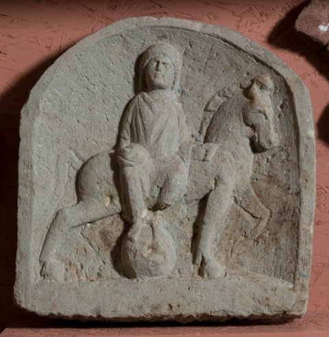 - Mythische Figur: Epona frontal auf einem nach rechts gehenden Pferd, in der Rechten Frucht (?), unter den Füßen Globus (?).