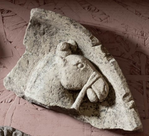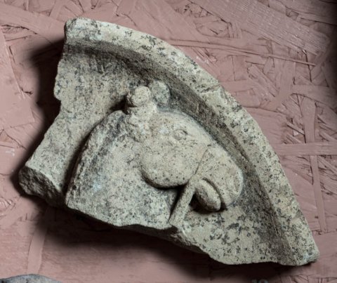 - Mythische Figur: Pferdekopf von einem rundbogig gerahmten Epona-Relief.