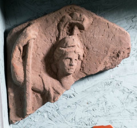 - Mythische Figur: Minerva mit Helm und Lanze. Rahmenlose Platte mit Giebel.
