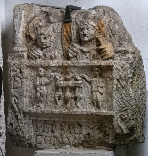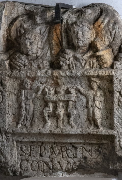 Im Hauptbild Familie: zwischen Säulen Brustbilder eines Ehepaares mit zwei Kindern. Links Frau, rechts Mann: Ärmeltunica, Sagum, Scheibenfibel, in der Linken Rolle (volumen). Vorn links Mädchen, rechts Knabe im Sagum.