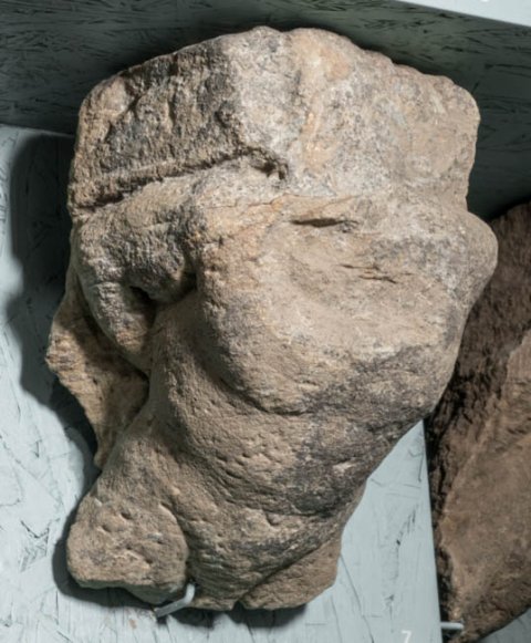 - Konsole, die vom Nacken und den auf den Rücken gelegten Armen eines nackten Atlanten getragen wird. Fragment eines weiteren Atlanten vorhanden.