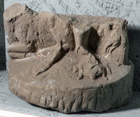 - Mythische Figur: auf halbrunder Basisplatte stehender Mercur, neben dem rechten Bein liegender Widder, neben dem linken Hahn, unter derm linken Fuß Schildkröte.