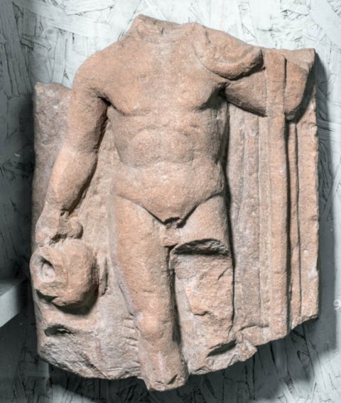 - Mythische Figur: stehende nackte Gottheit, in der Rechten Henkelgefäß, in der Linken Stab (Szepter). Auf der linken Schulter Mantel. Rückseite abgerundet.
