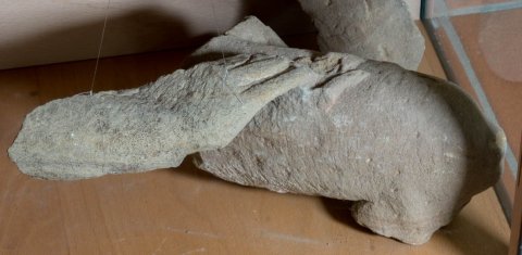 - Mythische Figur: Oberschenkel und Knie eines hochgestellten rechten Beins, darauf liegende rechte Hand. Weiters erhalten: linkes Knie und Unterschenkel, linker Unterarm (?).