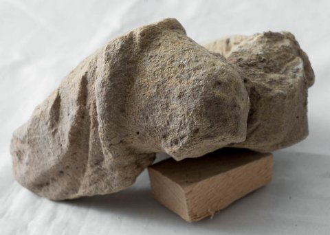 - Knie eines sitzenden Mannes (?) mit Mantelrest auf dem Oberschenkel.