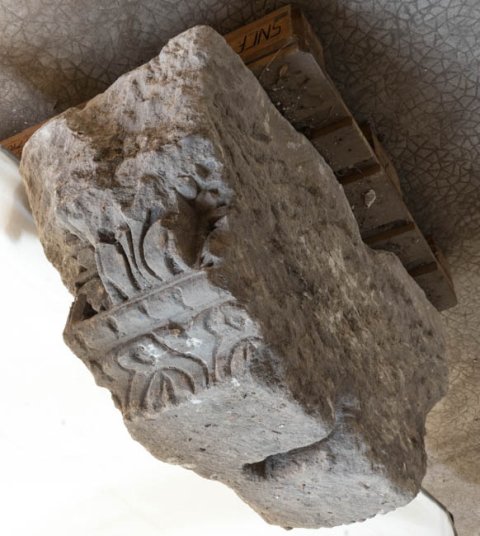 - Block mit Profilierung auf zwei gegenüberliegenden Seiten. Konsolgesims, unten Flechtband und Blattkyma.