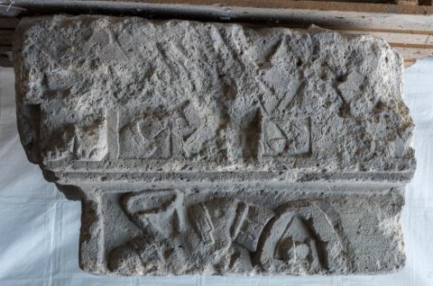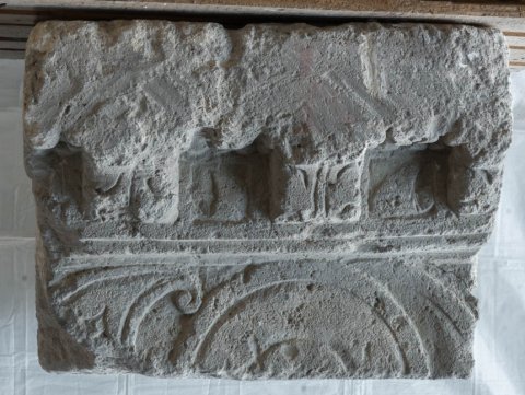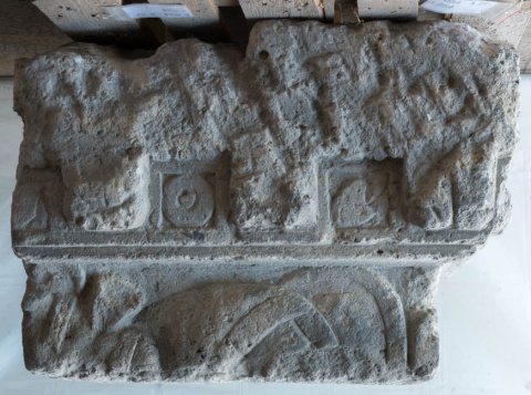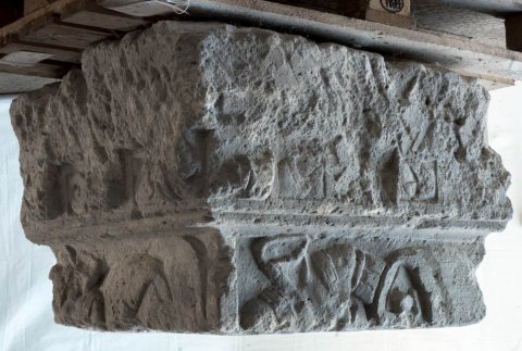 - a. auf zwei aneinander stoßenden Seiten Waffenreliefs, darüber Konsolgesims, zwischen den Blattkonsolen Metopen mit Waffen. b. Waffenrelief, darüber Konsolgesims.
