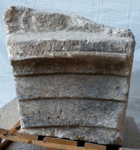- auf der Vorderseite Rankenornament, darüber Blattkyma; auf der Rückseite Fasciengliederung, oben einfaches Profil