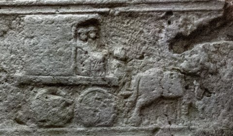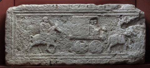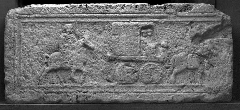 - Wagenszene: in friesartigem Feld vierrädriger Planwagen mit Zweigespann, Kutscher und zwei Fahrgästen. Hinter dem Wagen Reiter.
