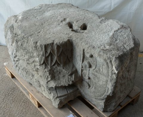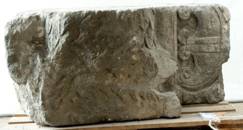 - Halbsäule mit geschupptem Schaft und profilierter Basis, auf dem rechts anschließenden Wandstück Peltenschild.