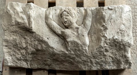 - Mythische Figur (?): nackter Oberkörper einer Frau (Mänade ? Hesione ?) mit hoch erhobenen Armen. Links Rahmen und Reliefrest, auf der rechten Nebenseite vegetabiles Ornament.