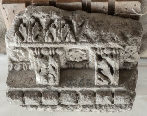 - Konsolgesims mit tordiertem Band, Zahnschnitt, Akanthuskonsolen, dazwischen Rosetten, Blattkyma