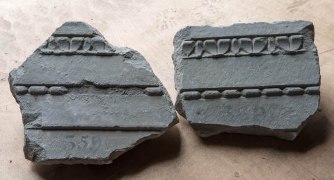 - schwach profilierte Platten mit Blattkyma und Perlstab