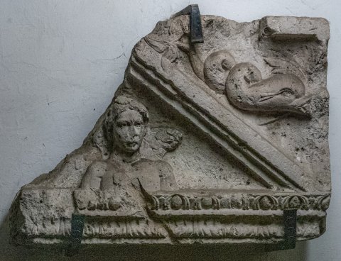 - Mythische Figur (Ikarus? Genius ?): eingeschriebener Giebel, profiliert gerahmt, unten Gesims mit Blatt- und Eierstab. Im Feld nackte Büste eines Knaben mit gescheiteltem Haar. Hinter seiner linken Schulter Flügel. Über den Giebelschrägen Delphine.