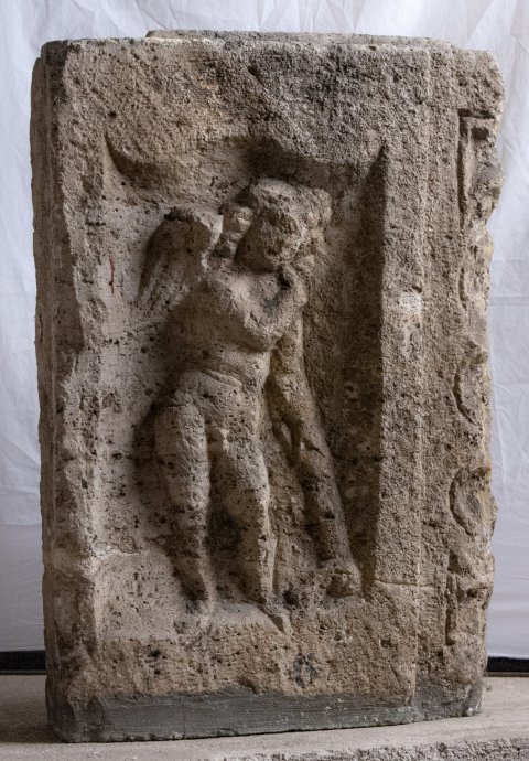 - Linkes Seitenfeld einer Sarkophaginschrift. In NIsche mit Bogenabschluss Trauergenius (nackter geflügelter Knabe mit langen Locken, auf gesenkte Fackel gelehnt). Rechts Rest des Inschriftrahmens mit sogen. Barockmotiv.