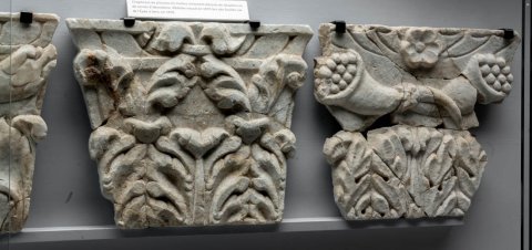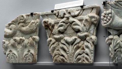 - drei Kapitelle: unten Akanthusblätter, oben a. Füllhörner, b. zusammengebundene Akanthusblätter. c. Delphine (?).