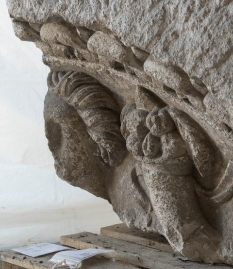 - Mythische Figur: unter Bogen mit Blattkyma noch der halbe Kopf der Göttin (Fortuna ? Abundantia ?) erhalten, daneben Füllhorn und Taenie. Im Zwickel über dem Bogen Spiralornament.