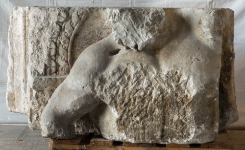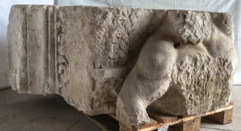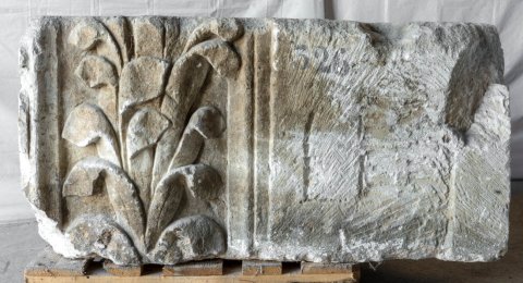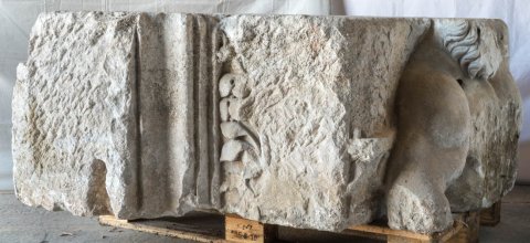 - Mythos (?): vor einem mit Flechtband gerahmten Bogen nackter Oberkörper eines bärtigen Mannes mit hoch über den Kopf erhobenem linken Arm. Hercules ? Auf der linken Nebenseite Reste eines Baums, anschließend glattes Profil und auf Anschluss gearbeitete Fläche. Auf der Rückseite gerahmtes Feld mit Pflanze.