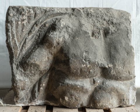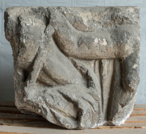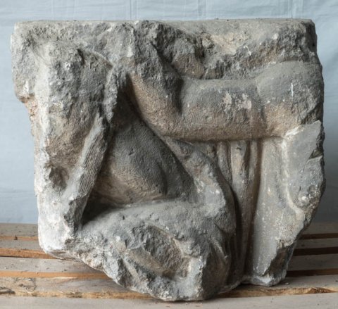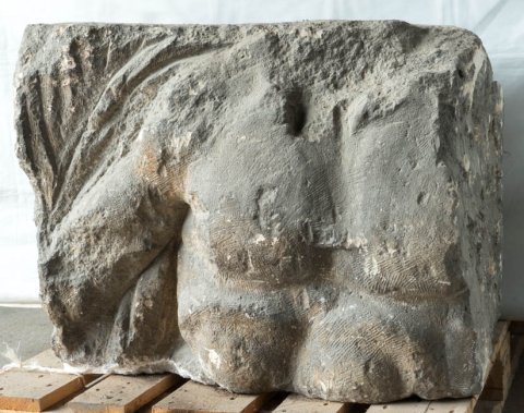 - Mythische Figuren: nackter Oberkörper eines Gottes mit Szepter im linken Arm (Jupiter ?). An seiner linken Seite erhobener rechter Arm einer weiblichen Figur (Victoria ?).