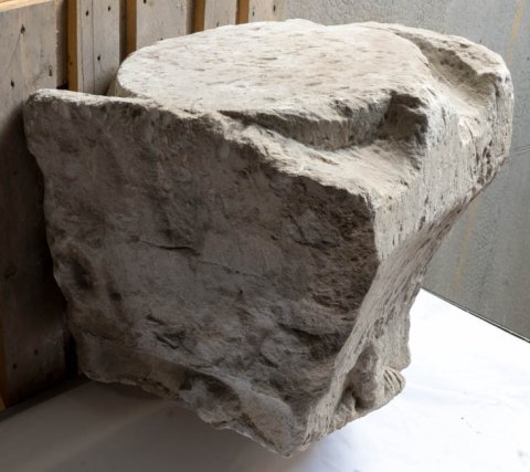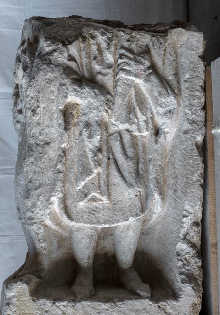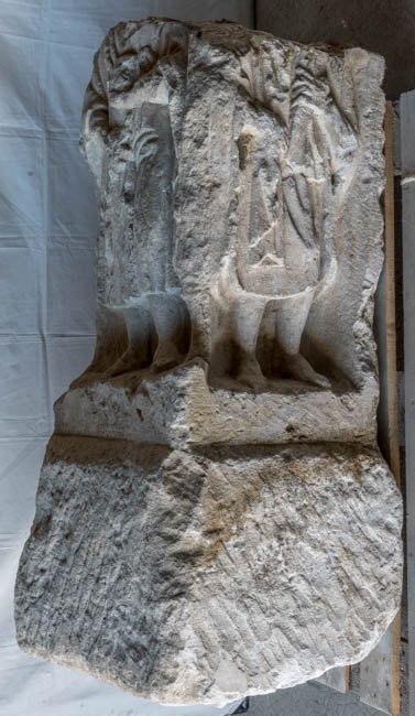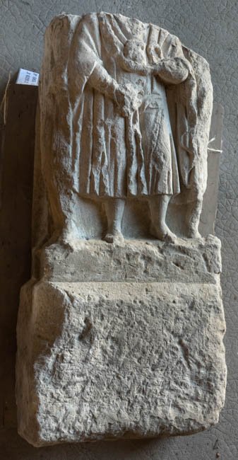 - An drei Seiten bearbeiteter Pfeiler, oben runde Fläche (für Bekrönung ?). Auf der Vorderseite Mann (Jüngling ?) in halblangem Ärmelgewand und Umhang, in beiden Händen Attribute. Auf der rechten Nebenseite bärtiger Mann in Paenula, auf der linken Frau im Mantel.